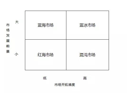 我們可以從市場開拓難度和市場發展前景兩個維度分析不同類型的市場。混沌市場的發展路徑不連續,開拓難度高,未來方向不確定,發展前景??;紅海市場已經相當成熟,開拓難度最低,市場競爭激烈,發展前景??;藍海市場相對藍冰市場而言,開發難度較低,藍海市場和藍冰市場同樣市場前景較大。