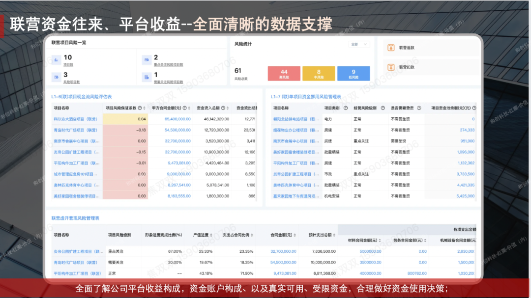 當前公司數(shù)字化程度較低,通過簡單的oa軟件、Excel表格、微信群、例會等傳統(tǒng)的管理方式進行管理。近幾年隨著公司省外業(yè)務(wù)的拓展,項目越來越大,傳統(tǒng)的低效管理模式已經(jīng)無法滿足日常的管理需求。公司聯(lián)營項目較多,個別項目出現(xiàn)資金挪用,虛開套現(xiàn),造成不必要的法律訴訟官司,甚至資金賬戶被凍結(jié)。此外,公司自營項目,人材機等各項成本,當前人工進行把控,項目利潤不達預(yù)期;人工進行統(tǒng)計,需要扒賬,實效性差,財務(wù)報表不能實時動態(tài)呈現(xiàn)。