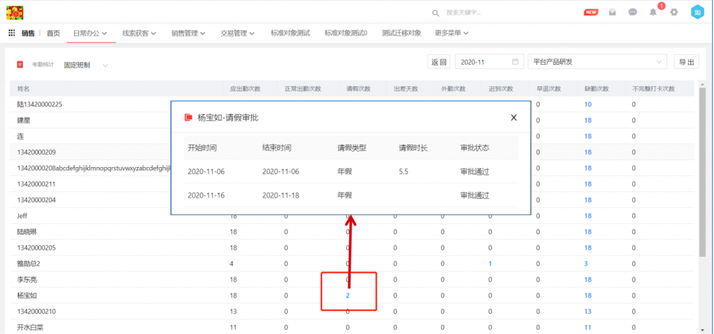 2)考勤統計中的請假天數列,改為請假次數,統計全部請假的申請次數,并支持點擊穿透到 請假列表。