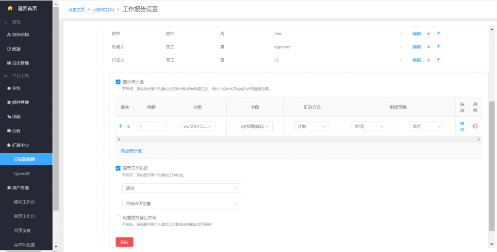 【后臺設(shè)置】系統(tǒng)設(shè)置—擴(kuò)展中心—已安裝應(yīng)用—工作報(bào)告—模板設(shè)置中,在原有統(tǒng)計(jì)值下面增加了顯示工作軌跡,可以配置一個對象的一個地圖定位型字段進(jìn)行統(tǒng)計(jì),統(tǒng)計(jì)時(shí)間默認(rèn)為報(bào)告時(shí)間段內(nèi),如周報(bào)默認(rèn)統(tǒng)計(jì)一周內(nèi)創(chuàng)建這個對象的數(shù)據(jù)