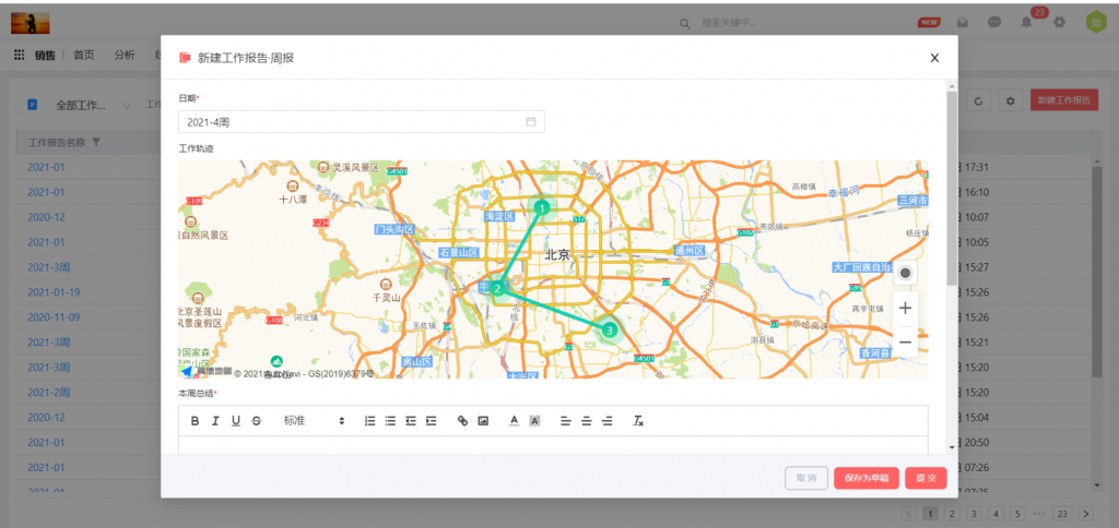 【前臺操作】新建工作報(bào)告、查看工作報(bào)告,可以根據(jù)后臺配置的軌跡對象的定位字段,形成地圖連線,并支持點(diǎn)擊查看詳情