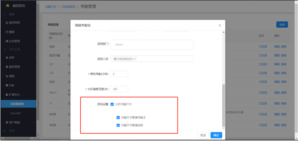 固定班制考勤設(shè)置,增加了是否允許外勤打卡設(shè)置(線上升級后默認(rèn)允許),并增加了外勤是否必須拍照或必須填寫備注