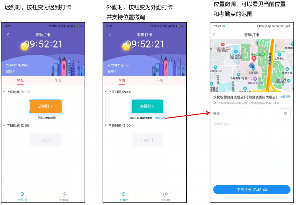 3)APP端考勤打卡頁面調(diào)整,支持位置微調(diào),遲到早退等異常打卡需填寫備注和拍照等