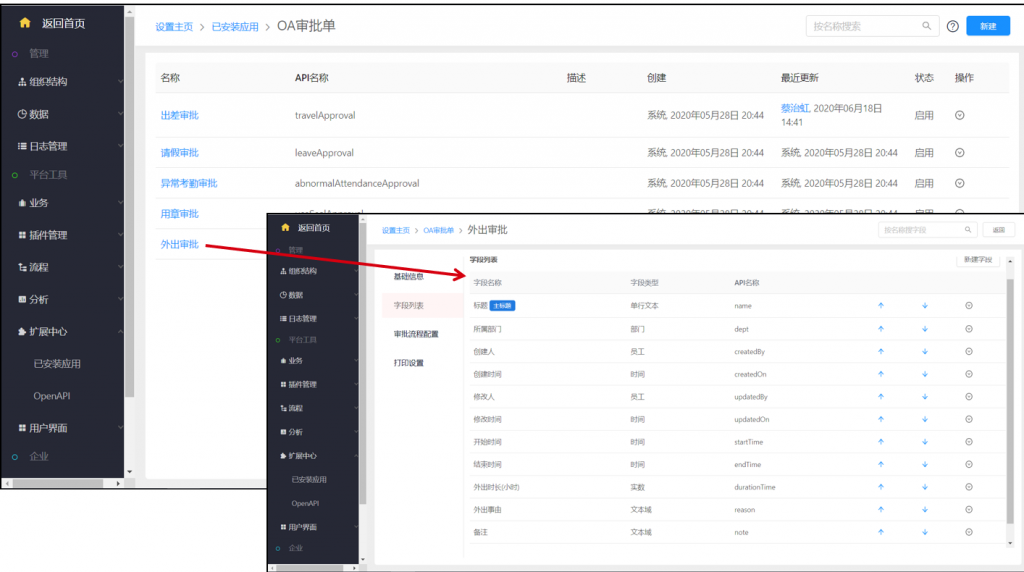 4)在OA審批單中增加“外出”審批,默認(rèn)內(nèi)置了開始時(shí)間、結(jié)束時(shí)間、外出時(shí)長、外出事由等字段;