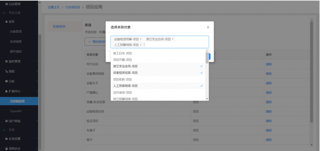 2)添加與項(xiàng)目關(guān)聯(lián)的業(yè)務(wù)對(duì)象,如合同、收付款、開票、設(shè)備和工程量清單等;