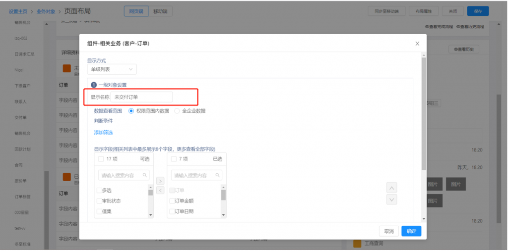 4)對(duì)象詳情頁相關(guān)列表組件可修改名稱,如在客戶詳情頁中,可以配置兩個(gè)訂單列表,分別命名為已交付訂單和未交付訂單