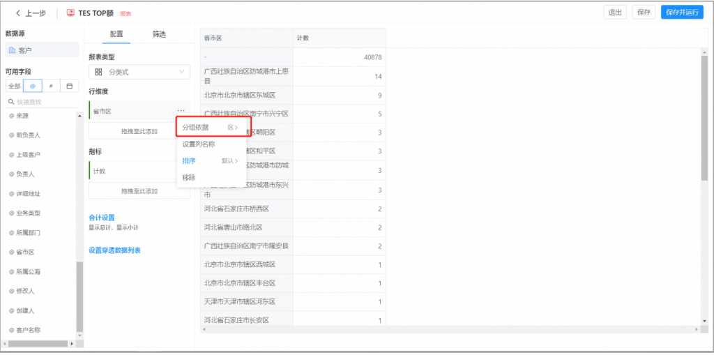 2)選項(xiàng)值集的單選字段,在作為維度時(shí),可以分層級(jí)統(tǒng)計(jì),類似部門;比如選擇一級(jí)進(jìn)行查看,每行維度會(huì)匯總當(dāng)前一級(jí)選項(xiàng)以及所有下級(jí)選項(xiàng)的數(shù)據(jù)