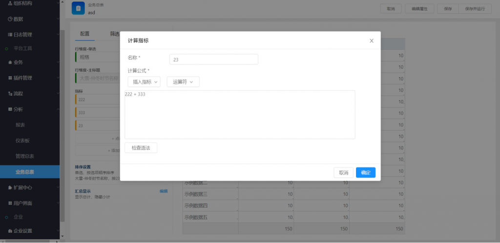 1) 與管理總表類似,業(yè)務(wù)總表中增加了計(jì)算指標(biāo),支持指標(biāo)列之間進(jìn)行簡單四則運(yùn)算,滿足更多的分析場(chǎng)景