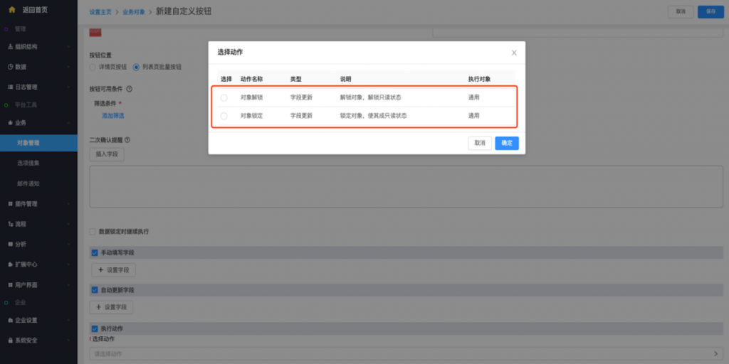 - 列表頁批量按鈕支持執行鎖定和解鎖動作:列表頁批量按鈕支持執行動作,可以執行鎖定和解鎖動作,在前端實現批量鎖定和批量解鎖