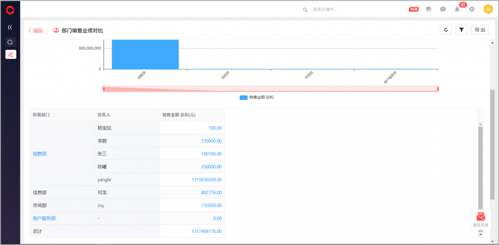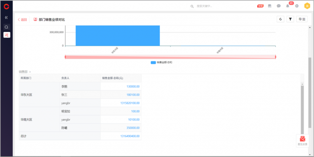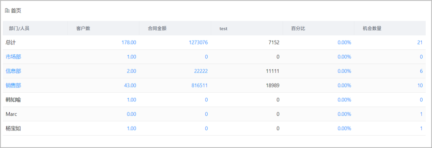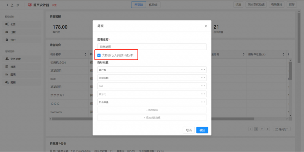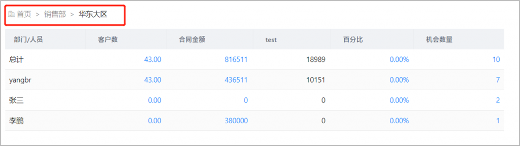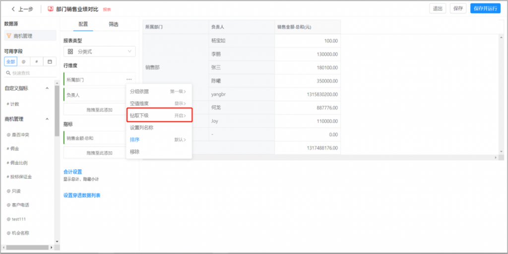 自定義報表支持部門下鉆:當以部門為維度時,可開啟部門下鉆,逐級查看下級部門的分析數(shù)據(jù)