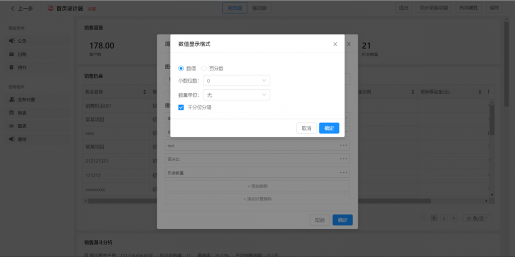 數(shù)值顯示格式:指標都支持數(shù)值顯示格式的設置,可設置單位、小數(shù)位數(shù)、百分比等