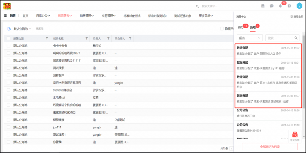 線索池、客戶池管理員分配數(shù)據(jù)后,系統(tǒng)會給新負責人發(fā)通知提醒