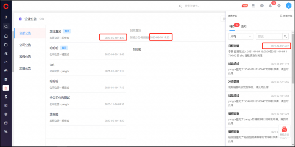 通知、待辦、公告、動態(tài)、審批流歷史中的時間顯示完整時間,如2021-05-21 10:11,時間留痕更嚴謹。