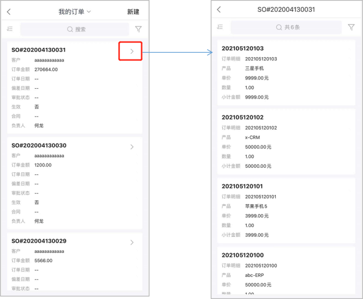 App端子對象列表顯示雙列:子對象組件中的字段會以兩列的方式進行展示,方便快速查看明細