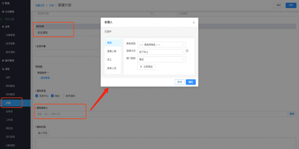 計劃的通知接收人選人組件優(yōu)化:計劃的通知接收人選人組件支持按角色、直接上級、員工、表單人員的維度