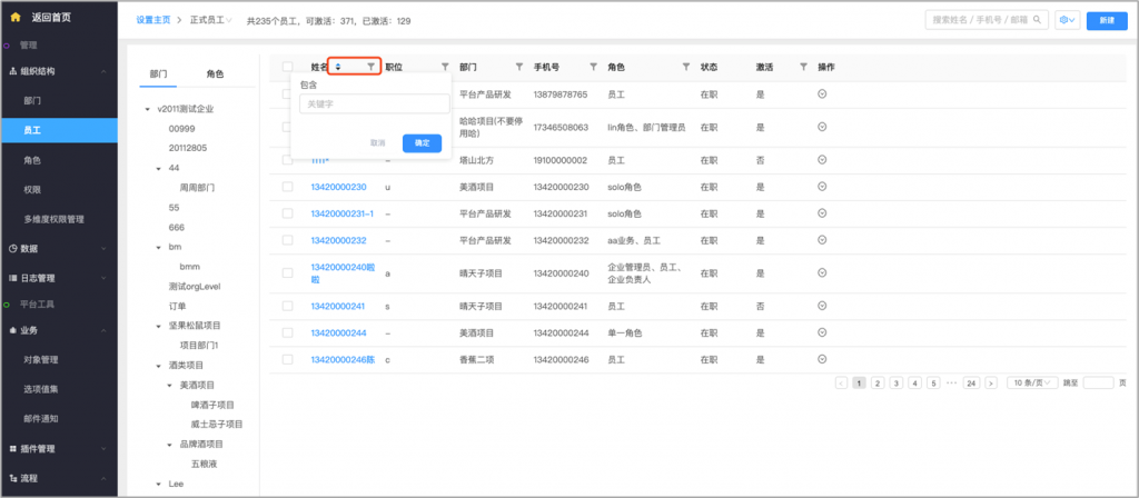 后臺員工列表支持篩選排序:后臺員工列表支持篩選及排序