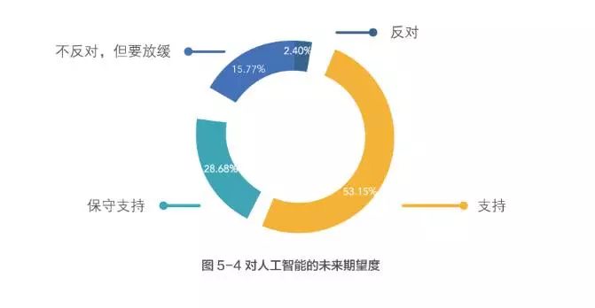 1)國民認(rèn)知:國民對人工智能認(rèn)知度高,超半數(shù)受訪者支持其全面發(fā)展。今日頭條的問卷調(diào)查顯示,只有6.23%的受訪者對人工智能不了解;53%受訪者支持人工智能全面發(fā)展,而持保守態(tài)度的為27%。