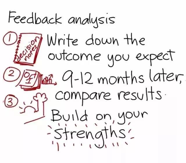 要發(fā)現(xiàn)自己的長處,唯一途徑就是回饋分析法(feedback analysis)。每當(dāng)做出重要決定或采取重要行動時,你都可以事先記錄下自己對結(jié)果的預(yù)期。9 到 12 個月后,再將實(shí)際結(jié)果與自己的預(yù)期比較。