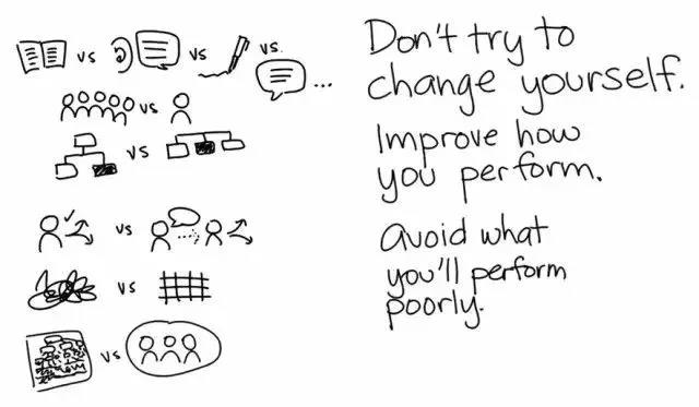 下面這個結(jié)論值得我們反復(fù)強(qiáng)調(diào):不要試圖改變自我,因?yàn)檫@樣你不大可能成功。但是,你應(yīng)該努力改進(jìn)你的工作方式。另外,不要從事你干不了或干不好的工作。