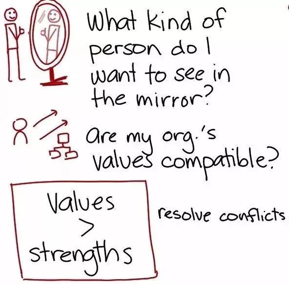 一個人的工作方式和他的長處很少發(fā)生沖突,相反,兩者能產(chǎn)生互補(bǔ)。但是,一個人的價值觀有時會與他的長處發(fā)生沖突。