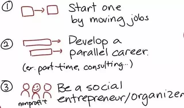 他們雖然繼續(xù)做著原來的工作,但在這份工作上花的時間越來越少。他們同時開創(chuàng)了另一項(xiàng)事業(yè),通常是非營利性活動。