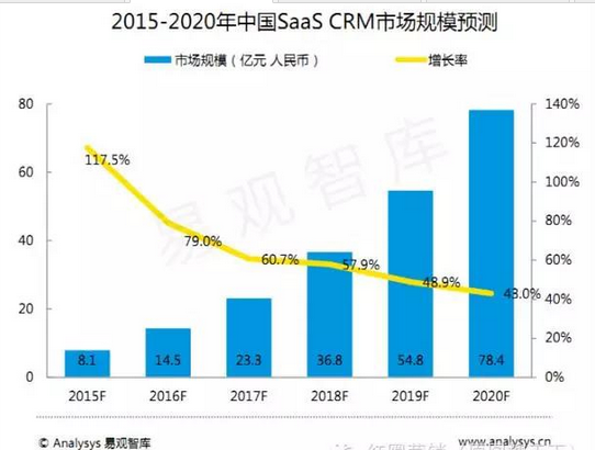 報(bào)告指出,國(guó)內(nèi)SaaS CRM市場(chǎng)在2014年的增長(zhǎng)率達(dá)到了176.9%,市場(chǎng)規(guī)模從1.3億元人民幣增長(zhǎng)到了3.7億元人民幣,2015年的增長(zhǎng)率預(yù)計(jì)達(dá)到117.5%,市場(chǎng)規(guī)模增長(zhǎng)到8.1億元人民幣。2015-2020年市場(chǎng)還會(huì)保持較高速度增長(zhǎng),但是隨著市場(chǎng)規(guī)模的逐漸擴(kuò)大,增長(zhǎng)將趨于平穩(wěn),中國(guó)傳統(tǒng)中小企業(yè)的互聯(lián)網(wǎng)化轉(zhuǎn)型將成為市場(chǎng)規(guī)模增長(zhǎng)的主要?jiǎng)恿ΓS著中國(guó)傳統(tǒng)中小企業(yè)互聯(lián)網(wǎng)化轉(zhuǎn)型的逐漸完成,SaaS CRM市場(chǎng)的企業(yè)數(shù)量將保持在一個(gè)平穩(wěn)的水平,市場(chǎng)的規(guī)模增長(zhǎng)將來(lái)源于更加專業(yè)以及更加多元化的產(chǎn)品服務(wù)。