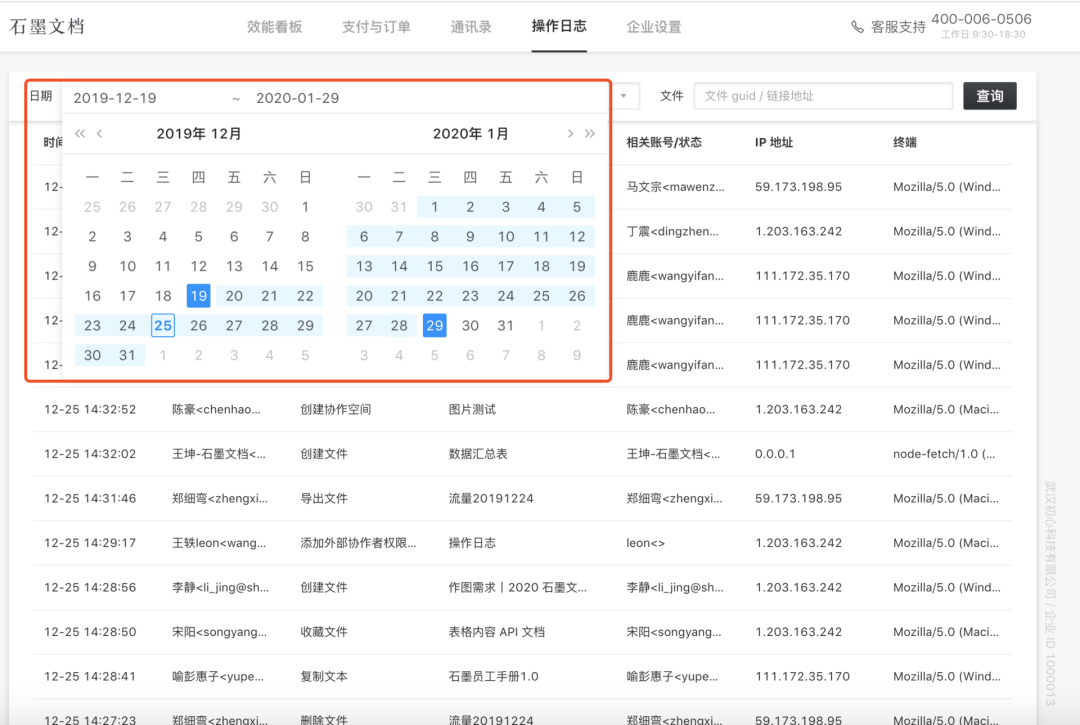企業創建者和管理員在后臺可以查詢某一時間段的所有操作日志。