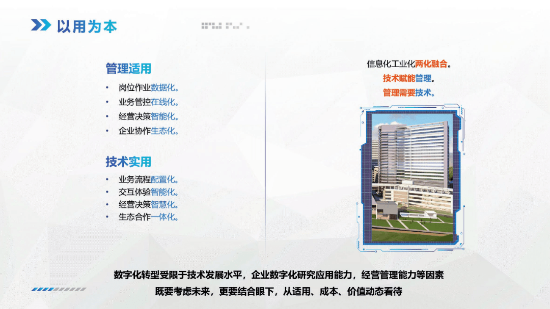 (2)技術實用包括:業務流程配置化、交互體驗智能化、經營決策智慧化、生態合作一體化。這些技術是和管理所匹配的,建設企業面臨的環境是非常復雜的,在數字化過程中,如何權衡業務、管理和技術,不僅僅是對技術能力的考驗,更要把握管理需要什么樣的技術匹配。我認為,首先要有一個好的管理平臺,在這種平臺上,業務骨干、技術人員可以把有限的精力放在如何賦能業務,而不是把時間都耗在加班加點的埋頭實現上。我們不能讓技術限制住企業的管理,但是很多企業卻實實在在的沒有用好技術,一方面想利用數字化手段幫助經營,一方面太過于聚焦眼前,沒有一個好的規劃,導致在實施時往往頭痛醫頭,腳痛醫腳,并沒有從根本上解決企業的管理問題。要想做好這些,一個強大的業務骨干團隊、一個落地能力很強的技術團隊、一個強大有力耐得住寂寞的決心都是非常重要的。業務的變化在所難免,我們運用數字化手段,降低各種變化所帶來的企業陣痛,用好技術平臺并不僅是針對當前模式能用好,更要在未來多變的商業環境中,企業姿態發生調整時,依然能夠快速響應,這樣的技術平臺才是我們需要提前規劃好的事情。而從業務流程配置化、交互體驗智能化、經營決策智慧化、生態合作一體化也是這種技術平臺能夠支持和解決的,這些點也是我們在選擇技術平臺前所必須考量的具體內容。