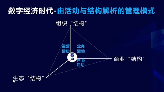 我們對(duì)于今天任何一個(gè)企業(yè)的數(shù)字化轉(zhuǎn)型,大家記住,跟工業(yè)時(shí)代不太一樣的是你得完成三個(gè)結(jié)構(gòu):一個(gè)結(jié)構(gòu)是現(xiàn)在有的組織架構(gòu),一個(gè)是你跟顧客關(guān)系的商業(yè)結(jié)構(gòu),還有一個(gè)是你跟產(chǎn)業(yè)關(guān)系的生態(tài)結(jié)構(gòu)。你必須得三個(gè)結(jié)構(gòu)都做到。如果你沒有能力,從組織結(jié)構(gòu)這個(gè)系統(tǒng)完成運(yùn)營跟業(yè)務(wù)活動(dòng),從商業(yè)結(jié)構(gòu)這個(gè)系統(tǒng)完成業(yè)務(wù)跟產(chǎn)業(yè)活動(dòng),然后從產(chǎn)業(yè)結(jié)構(gòu)這個(gè)系統(tǒng)完成運(yùn)營跟產(chǎn)業(yè)活動(dòng),你是不可能做數(shù)字化轉(zhuǎn)型的。