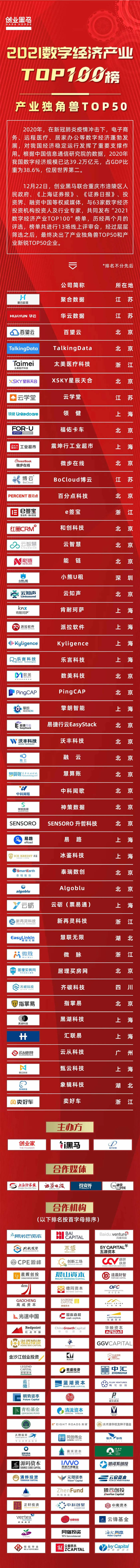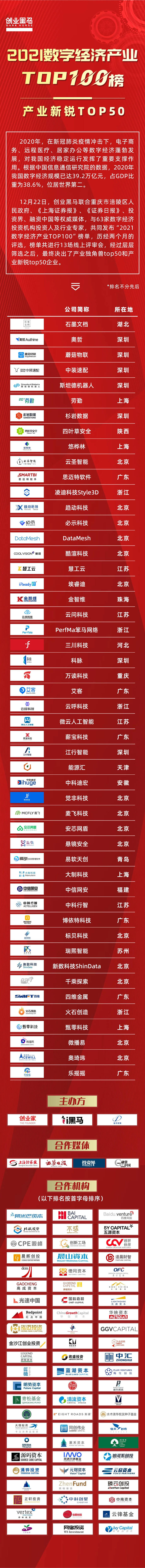 基于此,12月22日創(chuàng)業(yè)黑馬聯(lián)合重慶市涪陵區(qū)人民政府、《上海證券報(bào)》、《證券日?qǐng)?bào)》、投資界、融資中國(guó)等權(quán)威媒體,與63家數(shù)字經(jīng)濟(jì)投資機(jī)構(gòu)投資人及行業(yè)專家,共同發(fā)布“2021數(shù)字經(jīng)濟(jì)產(chǎn)業(yè)TOP100”榜單。
