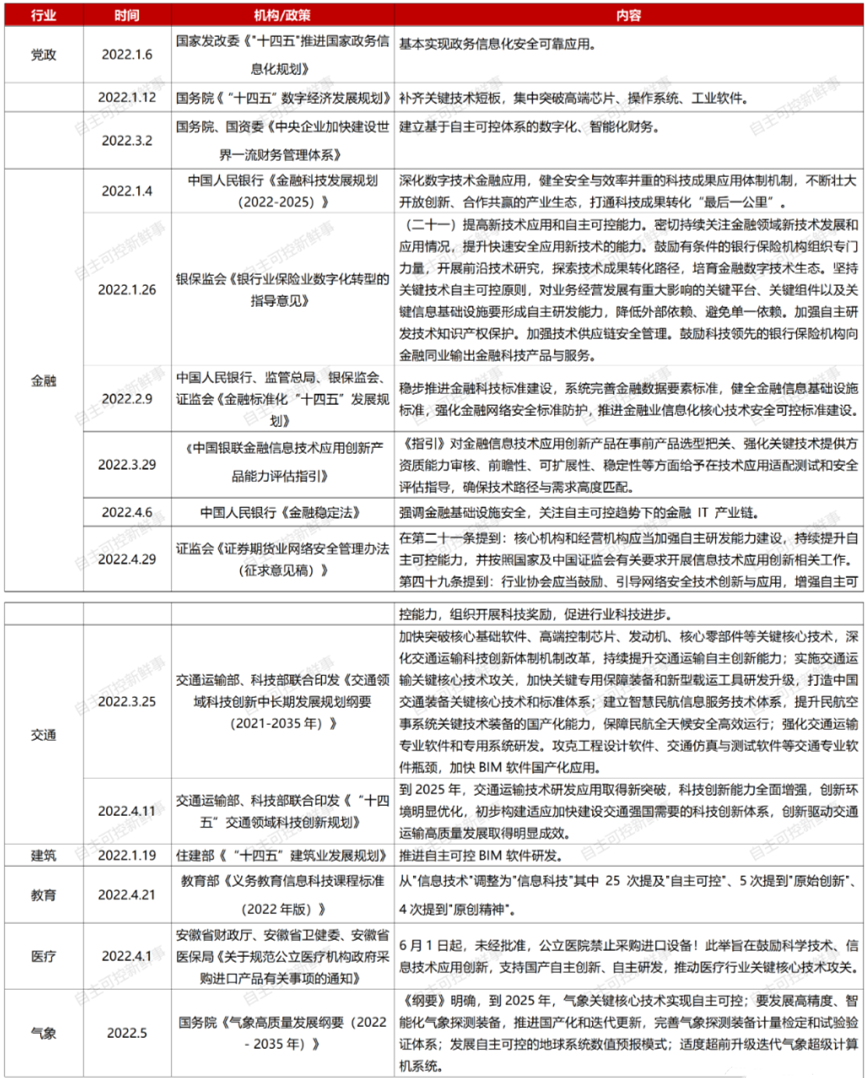 據(jù)不完全統(tǒng)計(jì),截至2022年6月13日,國(guó)家頂層設(shè)計(jì)層面共出臺(tái)信創(chuàng)相關(guān)政策14份。分行業(yè)來看,金融6份、交通2份、建筑1份、教育1份、醫(yī)療1份(安徽?。?、氣象1份。