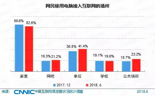 同樣,我國網(wǎng)民在家里通過電腦接入互聯(lián)網(wǎng)的比例為82.6%,與2017年末相比降低了3.0個百分點;在網(wǎng)吧、單位、學校、公共場所通過電腦接入互聯(lián)網(wǎng)的比例分別增長了2.0、4.6、0.5、4.5個百分點。在上網(wǎng)時長方面,2018年6月,中國網(wǎng)民的人均周上網(wǎng)時長為27.7小時,相比2017年末提高0.7個小時。