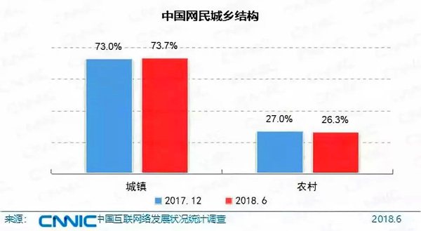 截至2018年6月,我國農(nóng)村網(wǎng)民規(guī)模為2.11億,占整體網(wǎng)民的26.3%,較2017年末增加204萬人,增幅為1.0%;城鎮(zhèn)網(wǎng)民規(guī)模為5.91億,占比達73.7%,較2017年末增加2764萬人,增幅為4.9%。我國不斷推進城鎮(zhèn)化進程,使得城鎮(zhèn)人口不斷增加,農(nóng)村人口不斷減少,城鄉(xiāng)網(wǎng)民結(jié)構(gòu)受此影響也發(fā)生了細微變化。