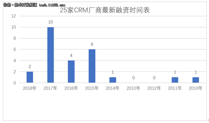 77家網(wǎng)上公開資料搜索到的CRM廠商中有25家是有明確的融資情況,從上圖我們可以看出資本越來越青睞于CRM領(lǐng)域,最新融資情況在2015年-2017年內(nèi)的廠商共有20家,占比為80%,商業(yè)模式的成熟、企業(yè)CRM認(rèn)知的提高以及市場(chǎng)需求或許是資本青睞的主要原因。