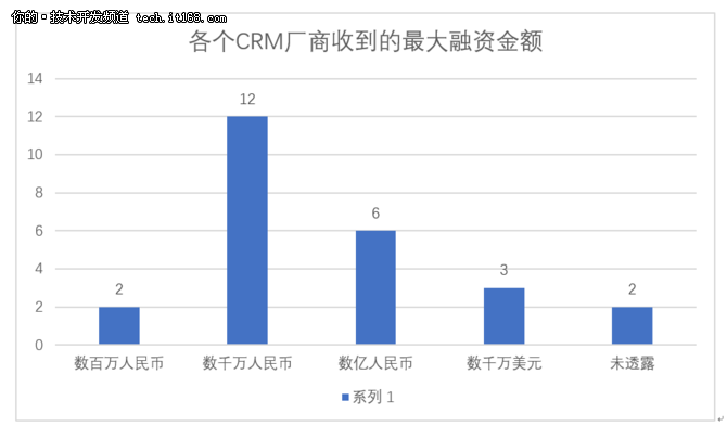 上圖總結(jié)了25家CRM廠商收到的最大融資金額, 我們將融資金額分為“數(shù)百萬人民幣”、“數(shù)千萬人民幣”、“數(shù)億人民幣”、“數(shù)千萬美元”以及未透露五個(gè)類別。其中12家公司收到最大的融資金額是數(shù)千萬人民幣。