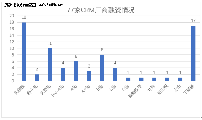 從77家CRM廠商的融資情況來看,除去17家融資情況不明確的廠商,有17家公司至今未獲投,B輪及B輪以前融資的公司有33家,占到總數(shù)的55%,相當(dāng)一部分CRM廠商還處于創(chuàng)業(yè)初期。