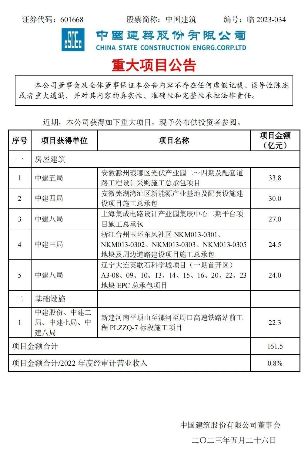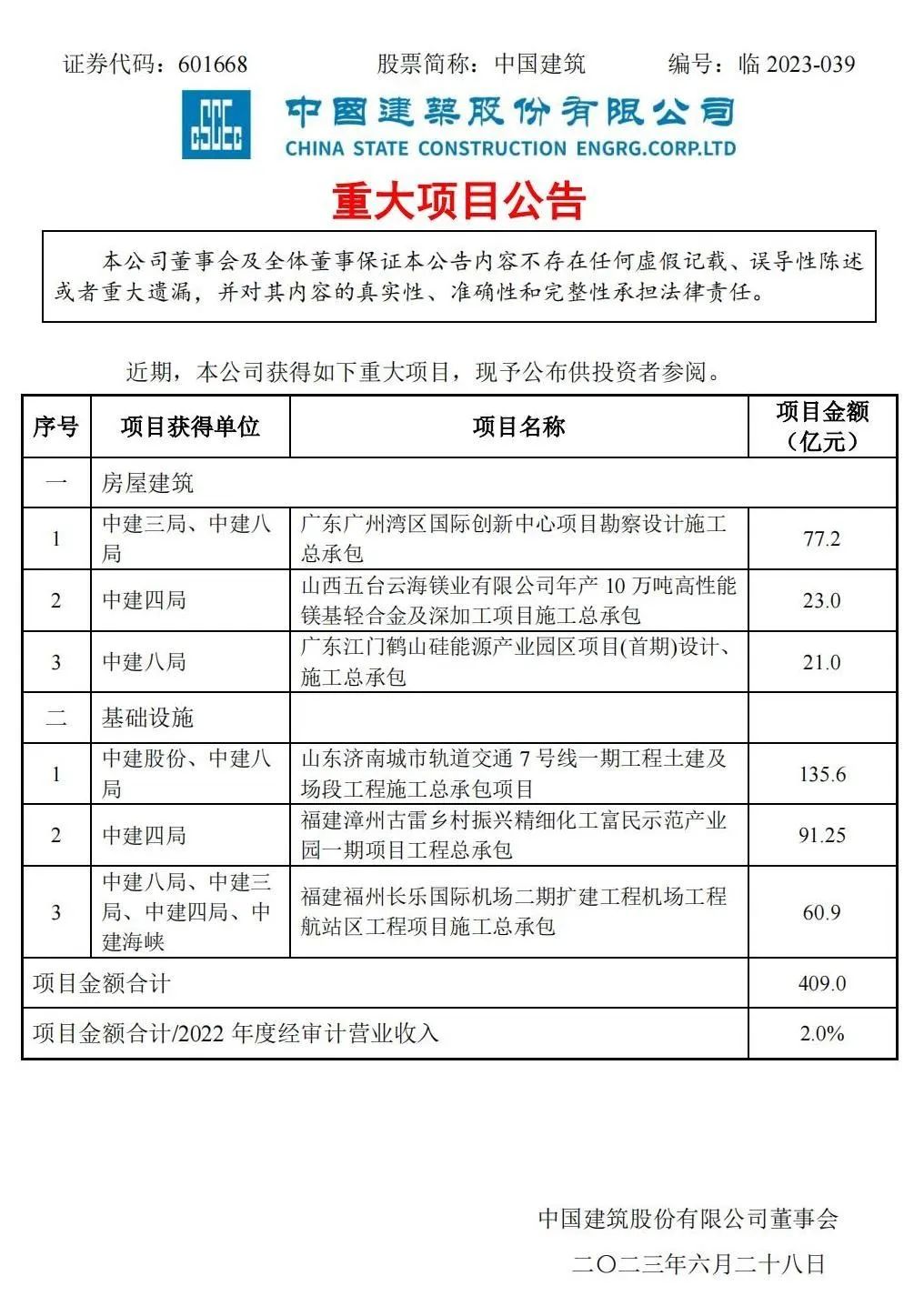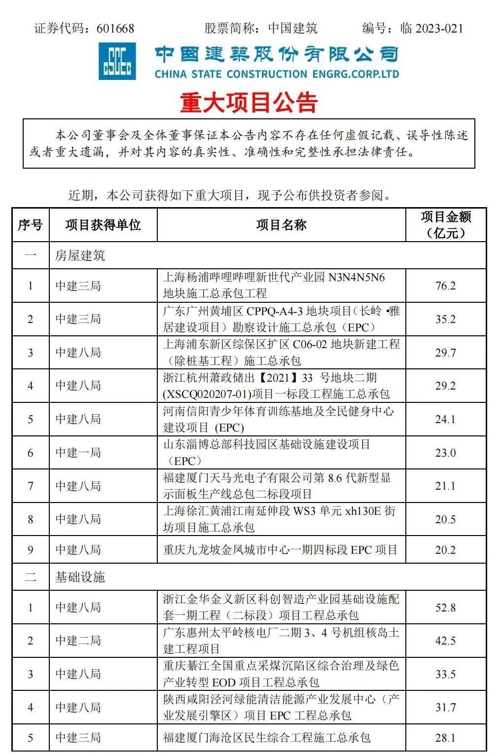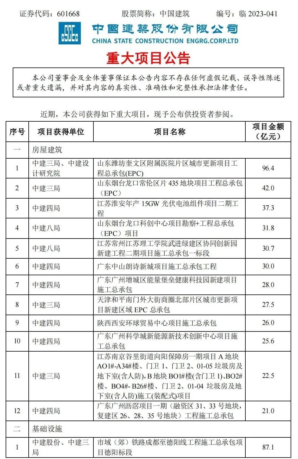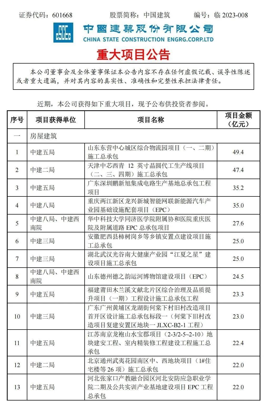 中國建筑20家子公司凈利潤出爐!附2023中標(biāo)重大項(xiàng)目名單!