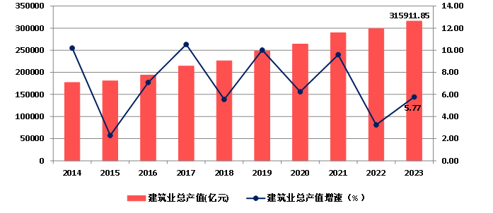 2014年以來,隨著我國建筑業(yè)企業(yè)生產和經營規(guī)模的不斷擴大,建筑業(yè)總產值持續(xù)增長,2023年達到315911.85億元,比上年增長5.77%。增速較上年提高2.52個百分點(圖3)。