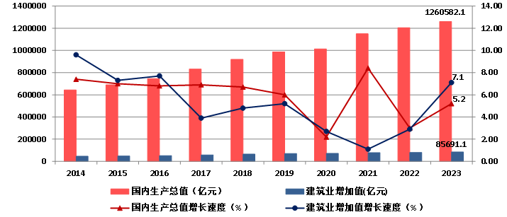 圖1 2014-2023年國內生產總值、建筑業(yè)增加值及增速