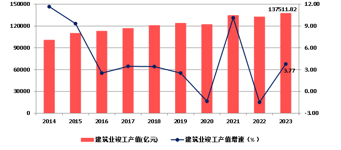圖3 2014-2023年全國建筑業(yè)總產值及增速