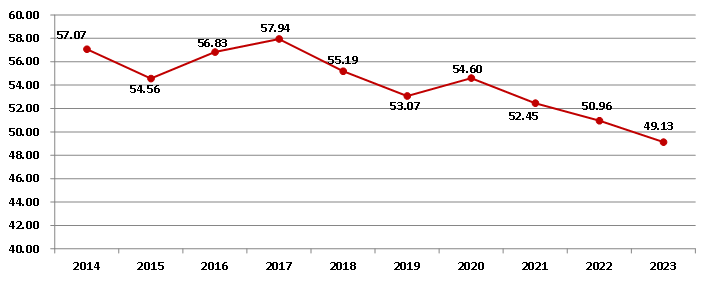 2023年,全國建筑業(yè)企業(yè)簽訂合同總額724731.07億元,比上年增長2.78%,增速比上年降低4.56個百分點。其中,本年新簽合同額356040.19億元,比上年降低0.91%,增速比上年降低5.19個百分點(圖10)。本年新簽合同額占簽訂合同總額比例為49.13%,比上年下降了1.83個百分點,連續(xù)三年下降(圖11)。