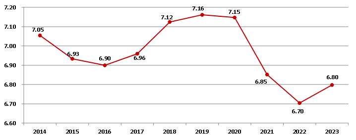 圖2 2014-2023年建筑業(yè)增加值占國內生產總值比重