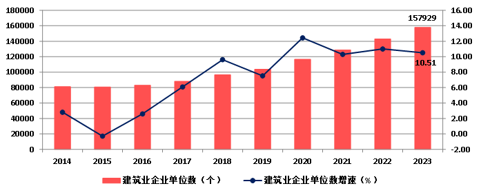 截至2023年底,全國有施工活動的建筑業(yè)企業(yè)157929個,同比增長10.51%;從業(yè)人數(shù)5253.79萬人,同比增長2.18%;按建筑業(yè)總產值計算的勞動生產率為464899元/人,同比下降3.90%。