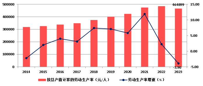 2023年,按建筑業(yè)總產值計算的勞動生產率為464899元/人,比上年下降3.90%,增速比上年降低6.14個百分點,增速連續(xù)兩年下降(圖8)。
