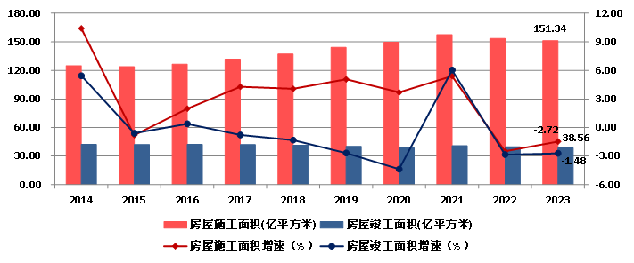 2023年,全國建筑業(yè)企業(yè)房屋建筑施工面積151.34億平方米,比上年減少1.48%。房屋建筑竣工面積38.56億平方米,比上年減少2.72%(圖12)。