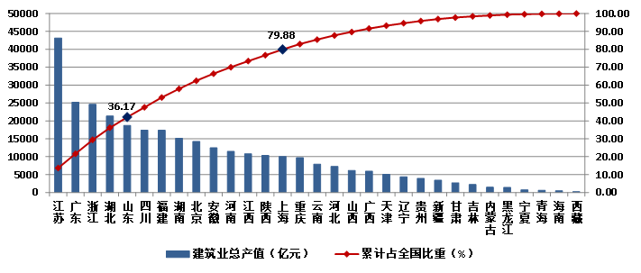 2023年,江蘇建筑業(yè)總產值達到43140.15億元,以絕對優(yōu)勢繼續(xù)領跑全國。廣東、浙江、湖北三省的建筑業(yè)總產值也都超過了2萬億元,分列第二、三、四位。4省建筑業(yè)總產值共占全國建筑業(yè)總產值的36.17%。除這4省外,總產值超過1萬億元的還有山東、四川、福建、湖南、北京、安徽、河南、江西、陜西、上海10個省市,上述14個地區(qū)完成的建筑業(yè)總產值占全國建筑業(yè)總產值的79.88%(圖15)。