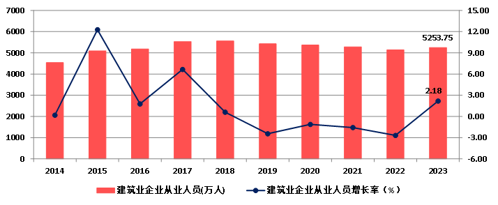 2023年,建筑業(yè)從業(yè)人數(shù)5253.75萬人,比上年末增加112.15萬人,增長2.18%,結束了連續(xù)三年減少的態(tài)勢(圖6)。