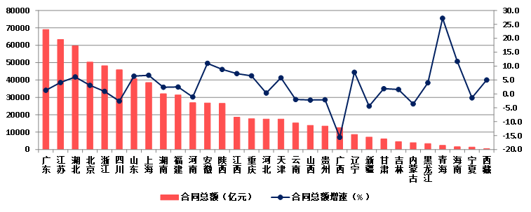 2023年,廣東建筑業(yè)企業(yè)簽訂合同總額繼續(xù)排在首位,達到68991.22億元,比上年增長1.3%;江蘇建筑業(yè)企業(yè)以63351.14億元排在第二位,比上年增長4.1%。兩省簽訂的合同總額占全國簽訂合同總額的18.26%。簽訂合同總額超過3萬億元的還有湖北、北京、浙江、四川、山東、上海、湖南、福建等8個地區(qū)。22個地區(qū)簽訂合同總額比上年增長,增速超過10%的有青海、海南、安徽等3個地區(qū),9個地區(qū)簽訂合同總額出現(xiàn)負增長,其中廣西出現(xiàn)了超過15%的負增長(圖19)。