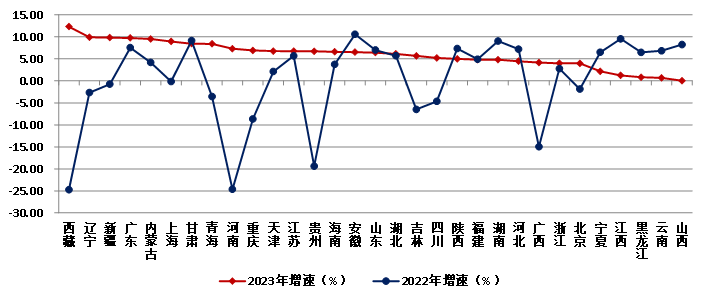 圖16 2022-2023年各地區(qū)建筑業(yè)總產值增速