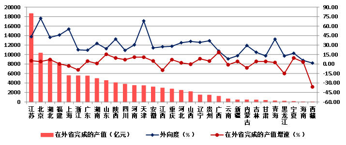 2023年,在外省完成的產值排名前兩位的仍然是江蘇和北京,分別為18656.62億元、10321.37億元。兩地區(qū)在外省完成產值之和占全部在外省完成產值的比重為26.99%。湖北、福建、上海、浙江、廣東5個地區(qū),在外省完成的產值均超過5000億元。從增速上看,23個地區(qū)在外省完成產值保持增長,廣西、山東、河南、天津的增速均超過10%。8個地區(qū)在外省完成產值出現(xiàn)下降,西藏、黑龍江分別出現(xiàn)了36.2%和15.0%的負增長。